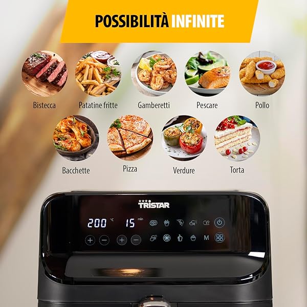 Questa friggitrice ad aria, esclusiva di Tristar, è dotata di un pannello di controllo digitale a sfioramento con schermo LCD, che la rende estremamente facile da usare. Seleziona uno dei tanti programmi di cottura pre-impostati o programma tu stesso il tempo e la temperatura di cottura desiderati. Puoi impostare la temperatura da 80°C a 200°C e il timer con suoneria fino a 60 minuti. Grazie alla potenza di 1700 Watt, la friggitrice raggiunge rapidamente la temperatura desiderata.