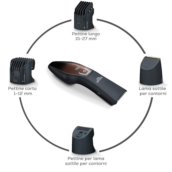 - 2 pettini regolabili in lunghezza (15-27 mm e 1-12 mm), 1 accessorio con lama sottile per contorni e dettagli, 1 pettine aggiuntivo per lunghezze di taglio di 1 mm, 3 mm e 5 mm